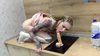In the dimly lit kitchen, our tattooed goddess, with her long braids and enticing stockings and socks, eagerly anticipates the passion that awaits them both.Her lover stands by her side, his eyes locked on the woman he so desperately craves.His hand gently touches her cheek, making her quiver in delight as they share a silent, passionate moment.He then reaches for the bright red dildo on the table beside them, knowing it'll bring them unimaginable pleasure.The kitchen counter serves as their stage for passion and lust, as she climbs onto its hard surface with a seductive grace.Her lover wastes no time in positioning the dildo in her wet pussy, watching with adoration as it fills her to capacity.As he slides the toy in and out, her hips meet his motions with fervor, both of them swept away by the waves of arousal surging between them.Her cries fill the air, punctuating the intensity of their passion.His hands find her breasts, kneading and pulling at the tender flesh as he continues to thrust, increasing the tempo to drive them towards climax.Their breathing grows heavier, mingling with the scent of arousal that permeates the space, urging them on.Soon, the dildo is replaced by his talented tongue, and she can no longer contain her climactic cries as he takes control with his skilled oral technique.But they're not done yet.He pulls away from her pussy long enough to unzip his jeans and free his raging hard-on.As her lover stands before her, their eyes locked, the moment stretches on with anticipation.She quickly straddles him, eager for the feel of him inside her, and slowly sinks down onto him, moaning in pleasure as he fills her with every stroke.As they become one, their bodies writhe and sway in tandem with the rhythm, drowning themselves in the sensations that surge between them.Her lover's hands are back to roaming over her body, kissing every inch of exposed skin as she rides him in a frenzied dance.He watches her intently, knowing this is a moment he'll never forget – their bodies intertwining as they seek the elusive release that awaits them.In the end, when both of them have been pushed to their limits and have reached ecstasy, she falls limply against him, their lips meeting in a tender embrace as the aftershocks continue to reverberate throughout the kitchen.Their love-filled encounter has changed them forever, leaving an indelible mark on the lives that they will continue to build together.And as the last remnants of passion fade into the background, they know one thing is for certain – they'll always look back and fondly recall that magical moment atop the kitchen counter in their delightful dildo riding adventure.